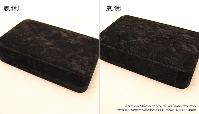 高級スエード調素材でできたネックレスとイヤリングのセットで収納出来る専用ケース。手触りもよく高級感のあるブラックカラーなのでギフトにもぴったりです。こちらのコレクションケースは蓋の裏部分にフックがありネックレスのチェーンを引っ掛ける仕組みになってます。またイヤリングの収納部分は縦に切り込み2箇所入っており差してセッティングします。差すだけですのでポストタイプやフックタイプのピアスも収納出来ます。