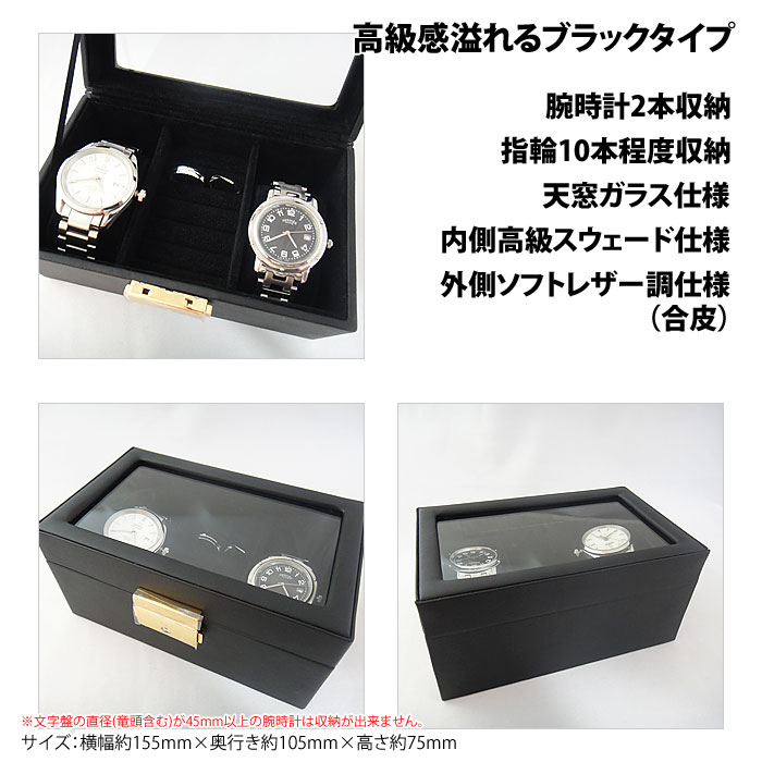 こちらは男性にもおすすめのブラックカラーになります。中の作りはブラウンと同じになり鍵付きとなっております。男性用の腕時計で文字盤が大きいもの(45mm以上)は収納できませんのでご注意下さい。男性でしたらリング部分にカフスなどをセットしてもいいですね。